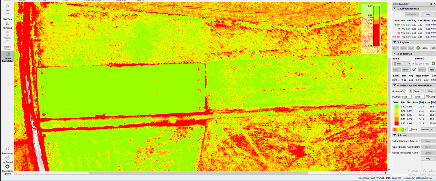 Para a captação das imagens desse projeto, utilizamos VANT/DRONE de modelo Asas-Fixas e câmera multiespectral para geração do Ortomosaico e desenvolvimento dos mapas de índices de vegetação.